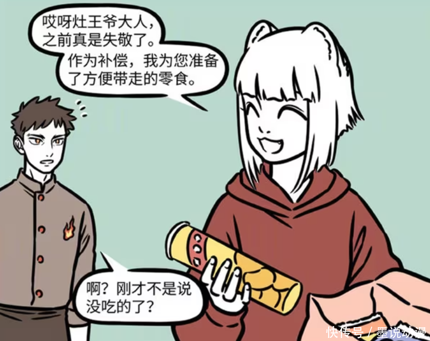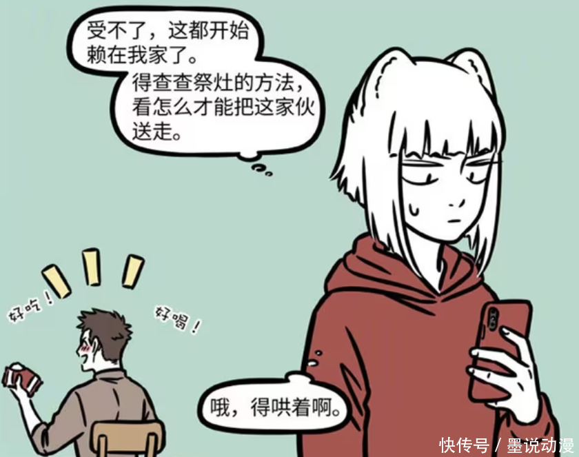 《非东说念主哉》漫画版中,九月烧了灶王爷的屁股之后,虽说他很不满,但也容易哄。九月奉上过时食品,灶王爷还很欢乐。为了送走灶王爷,九月还查了如何祭灶。送了好多零食之后,灶王爷被感动,九月的家也因此赢得五好家庭称呼。