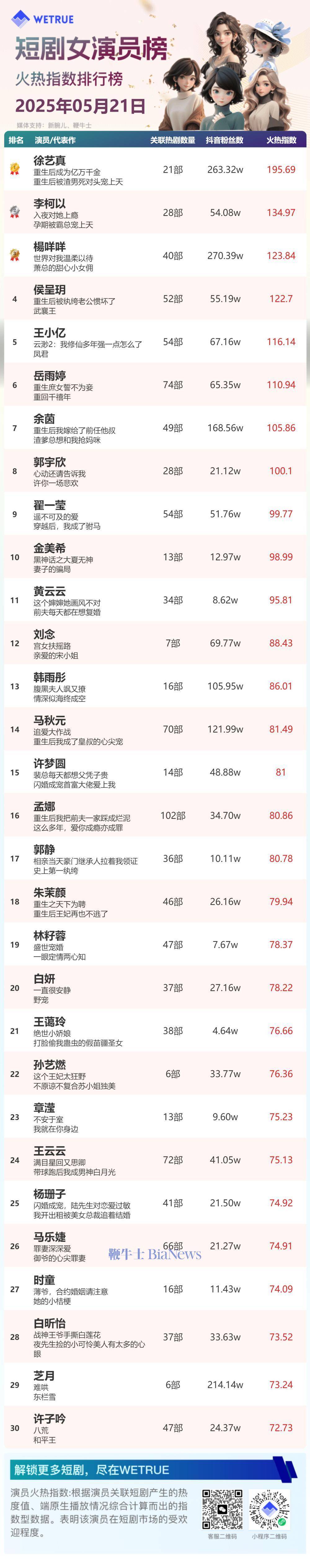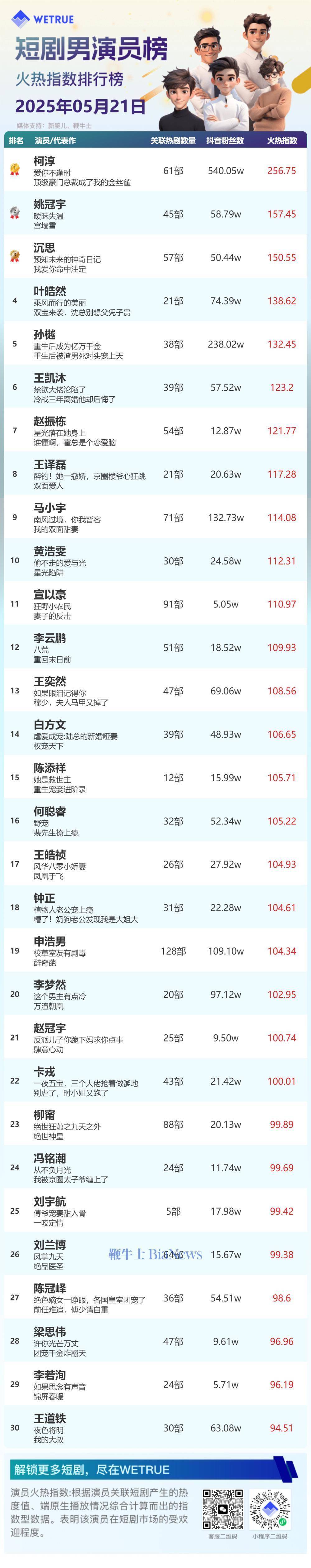 5月22日,为匡助短剧从业者提供更多信息开云体育(中国)官方网站,专注于短剧报说念的新腕儿和科技媒体鞭牛士纠合WETRUE短剧热度榜共同推出多种短剧热度榜。
