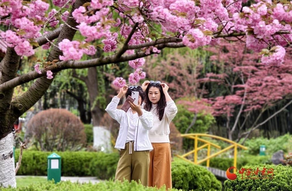 4月10日,在金徽酒文化生态旅游景区樱花正途,旅客拍照眷恋,定格好意思好春光。