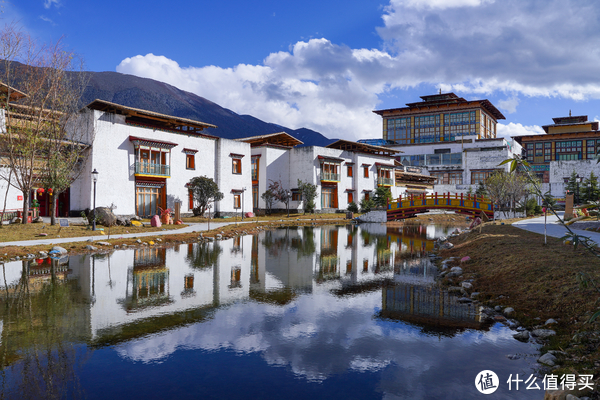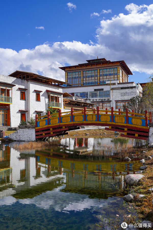 旅社多栋藏式大宅当中,还作念了一个水景庭院,这个小桥绝了。
