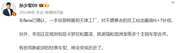 【CNMO科技音书】12月24日,据车fans首创东说念主、汽车博主@孙少军09 爆料,一汽丰田总部将搬到天津工场,对不肯意去的职工给出最高N+7抵偿。同期,丰田正在策动包括卡罗拉和雷凌、凯好意思瑞和亚洲龙等多个主销车型统一。他说丰田有些耳闻目染的经典车型,将会酿成历史。