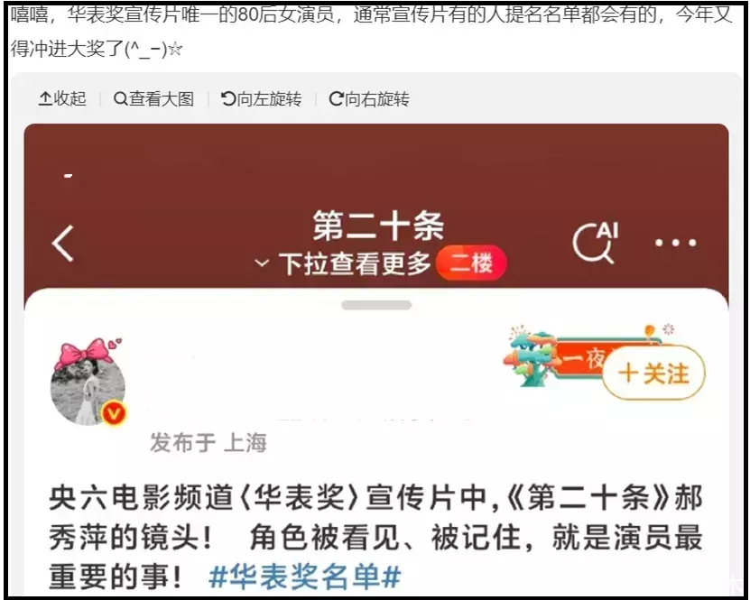 掐指一算,华表奖一届演员奖一共就两个,唯独四个东谈主可以赢得提名,《第二十条》雷喜讯和赵丽颖齐在华表奖宣传片中出镜了,唯独马丽莫得。