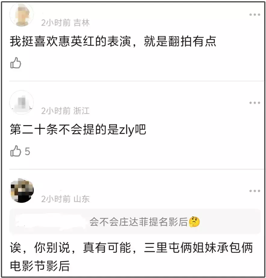 网友亦然越照拂越认为秘要,比年好几个奖项齐是相似的套路,先把竞争大、呼声高的从提名中排斥,拉几个竞争力不及的进来,再把奖给念念给的东谈主,赵丽颖是客串戏份少,惠英红主演的电影《我爱你》是翻拍,是以奖项是不是要给三里屯三姐妹之一了?