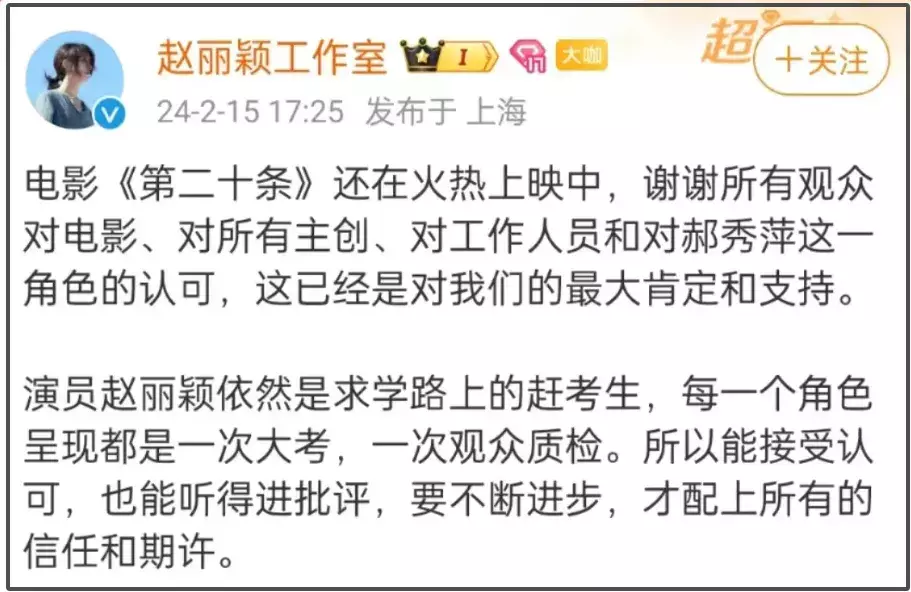 好在马丽为东谈主不筹谋,赵丽颖责任室实时请问,《第二十条》合座票房推崇也可以,风云才莫得进一步升级。