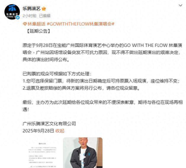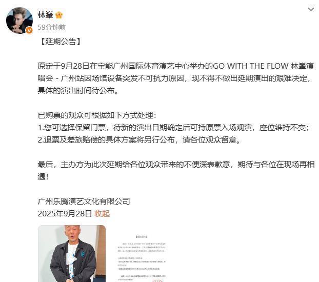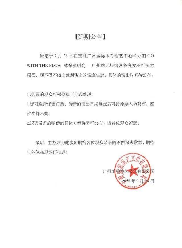9月28日17时24分,广州乐腾演艺文化有限公司发布公告:原定于9月28日在宝能广州海外体育演艺中心举办的“GOWITHTHEFLOW林峯演唱会—广州站”因场馆建造突发不成抗力原因,现不得不作念出宽限上演的忙绿决定,具体的上演期间待公布。