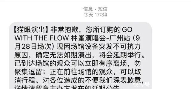 但9月28日的上演在开场前一个半小时临时晓喻宽限,除专揽方乐腾演艺发布公告外,猫眼、大麦等票务平台也向不雅众发出短信奉告上演宽限。