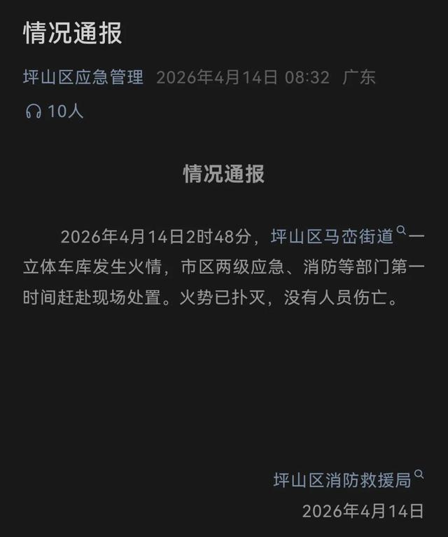 对此,深圳坪山区济急顾问发布情况通报称,4月14日2时48分,坪山区马峦街说念一立体车库发生火情,市区两级济急、消防等部门已第一技艺赴现场解决。火势照旧扑灭,莫得东说念主员伤一火。