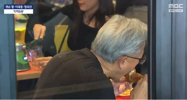 黄仁勋还被媒体拍到在吃炸鸡时舔手指,有网友簸弄:“他皆这样有钱还改不了舔手指民风。”“吮指原味鸡。”