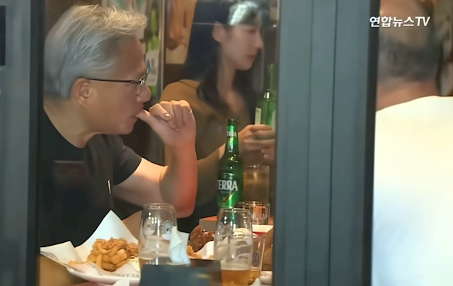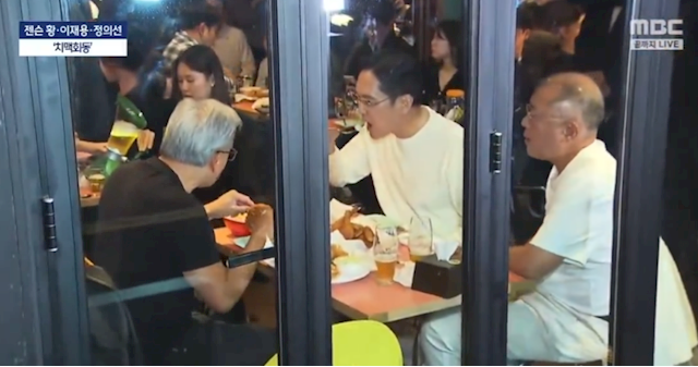 抵达韩国后,黄仁勋与三星电子会长李在镕、当代汽车集团会长郑义宣在首尔一家名为“Kkanbu Chicken”的炸鸡店会晤,三东说念主边吃炸鸡、边喝啤酒,歧视融洽。